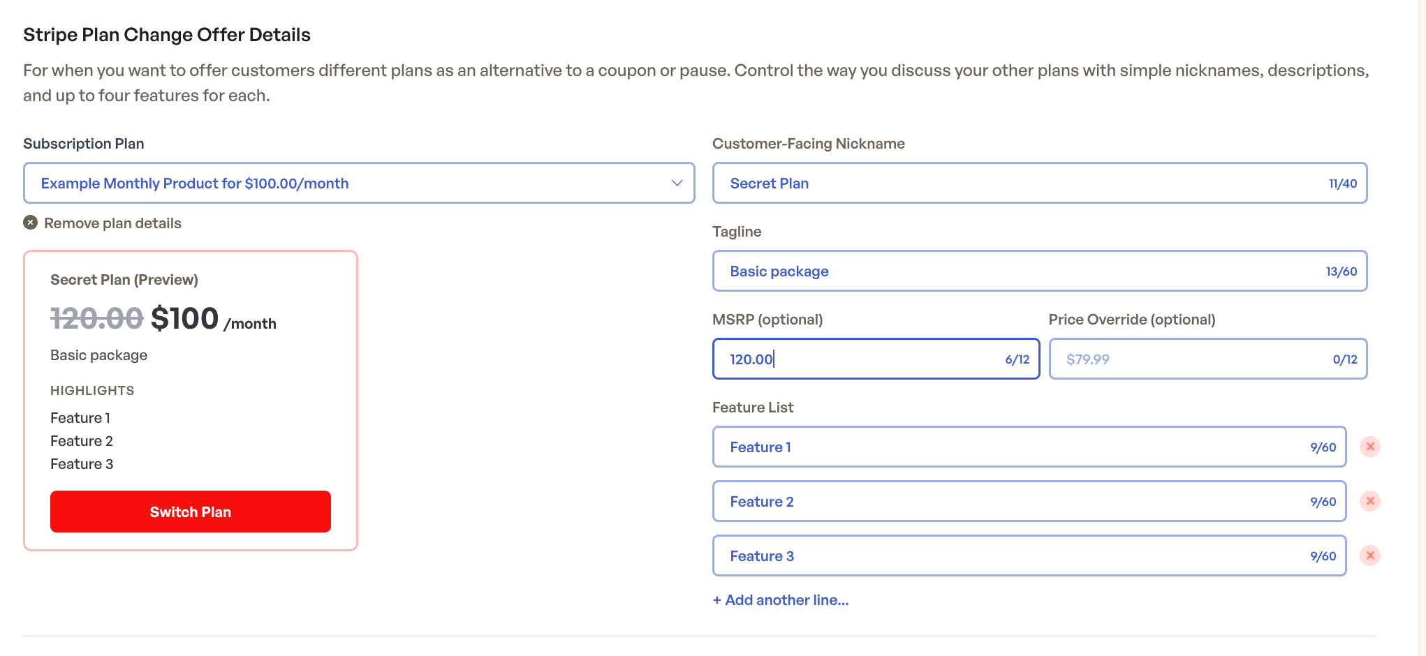 Each plan can have up to 8 feature highlights. These appear under the "Highlights" section when customers view plan options during the cancellation flow.